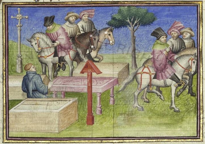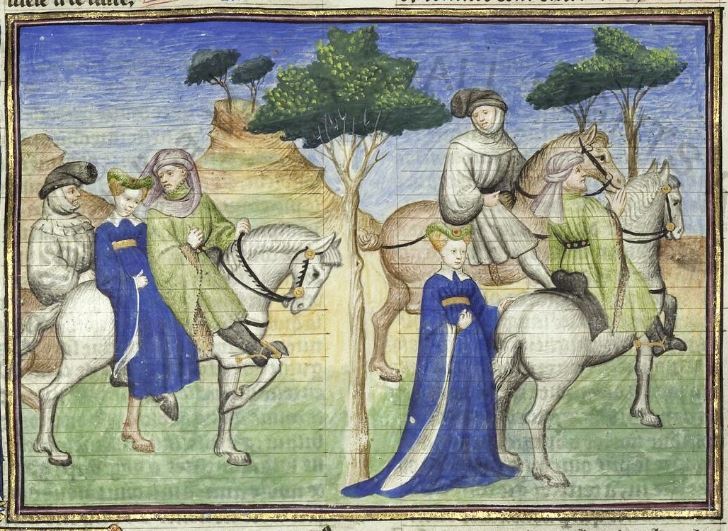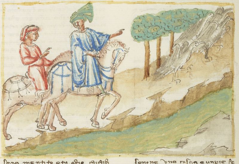 Parigi, Bibliothèque Nationale de France, It. 63, f. 199v. Il copista del manoscritto, datato 10 ottobre 1427, è Ludovico di Salvestro Ceffini. Chichibio e Currado a cavallo osserv…