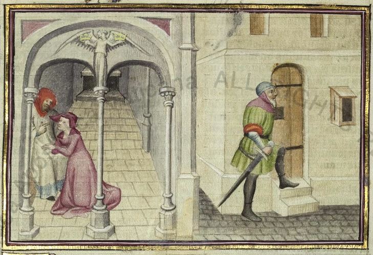 Maestro della Cité des Dames (1414-1419), Arimino ascolta la confessione della moglie; l'uomo monta la guardia alla porta di casa