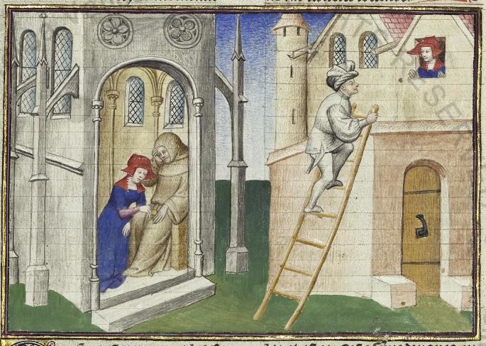 Maestro della Cité des Dames (1414-1419), Una donna va in chiesa a confessarsi; un giovane fa visita alla donna