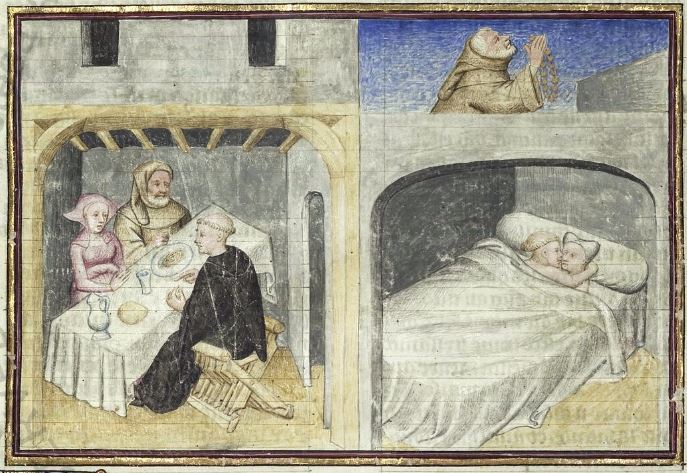 Maestro della Cité des Dames (1414-1419), Don Felice siede alla tavola di frate Puccio; don Felice giace con la moglie di Puccio