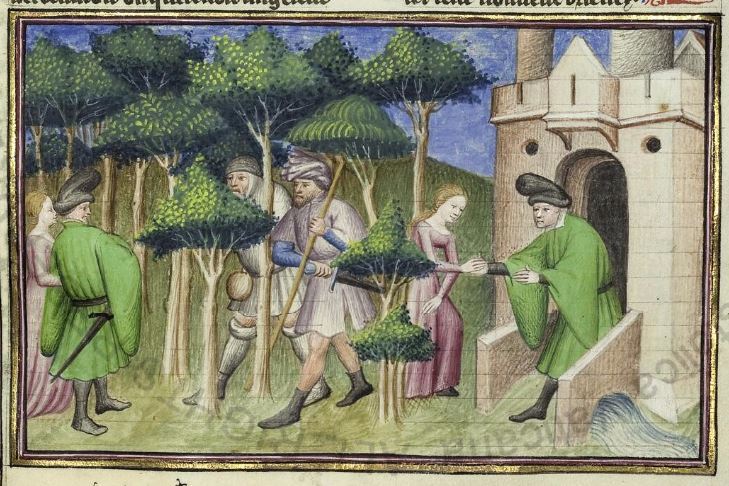Maestro della Cité des Dames (1414-1419), Pietro Boccamazza e l'Agnolella vengono aggrediti nel bosco; la coppia si ricongiunge
