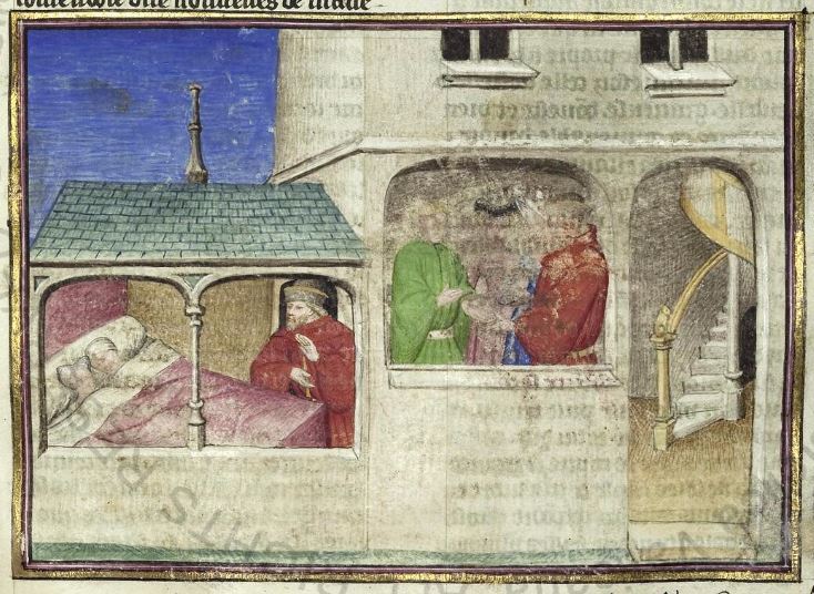 Città del Vaticano, Biblioteca Apostolica Vaticana, Pal. lat. 1989, f. 106v. Il copista del manoscritto, datato 15 giugno 1414, è Laurent de Premierfait. L'abate consegna alla mogl…