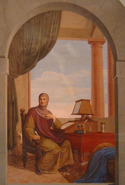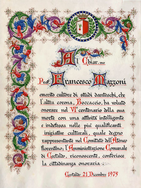 Firenze, Biblioteca Medicea Laurenziana, Acquisti e Doni 325, f. 1r. Manoscritto autografo di Giovanni Boccaccio. L'autore dell'opera, inginocchiato, porge un libro ad una fanciull…