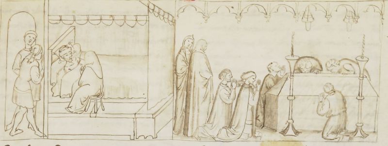 Miniatore fiorentino (1360-1390), La confessione di Ser Ciappelletto morente; il popolo venera l'arca con le spoglie di Ser Ciappelletto