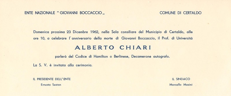 Conferenza del prof. Alberto Chiari in occasione dell'anniversario della morte di Giovanni Boccaccio23 dicembre 1962