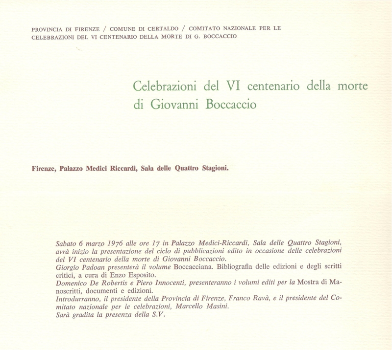 Presentazione del ciclo di pubblicazioni edito in occasione del VI Centenario della morte di Giovanni Boccaccio6 marzo 1976