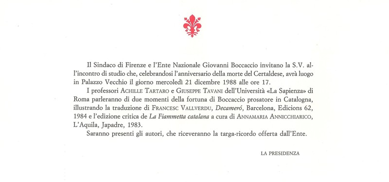 I professori Achille Tartaro e Giuseppe Tavani parleranno di due momenti della fortuna di Boccaccio prosatore in Catalogna a ricordo dell'anniversario della morte di Giovanni Bocc…