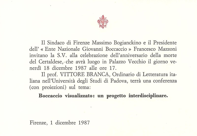 Il prof. Vittore Branca terrà una conferenza sul tema a ricordo dell'anniversario della morte di Giovanni Boccaccio18 dicembre 1987