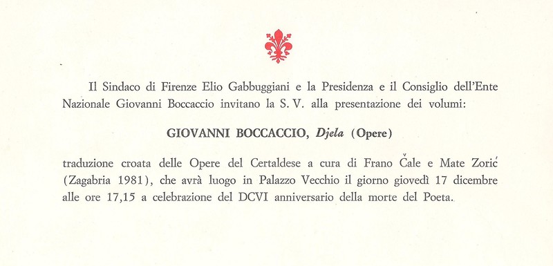 Presentazione della traduzione croata delle Opere di Giovanni Boccaccio nell'anniversario della sua morte17 dicembre 1981