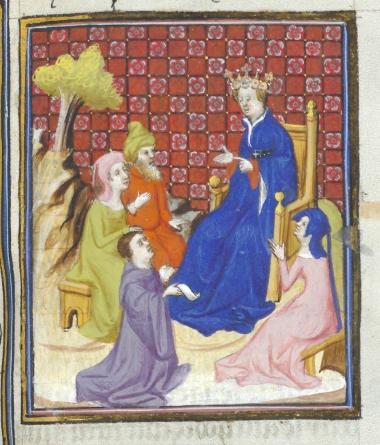 Bruxelles, Koninklijke Bibliotheek van België, 9509, f. 149r. Semiamira, assisa in trono, discute con alcune matrone ed un legista.