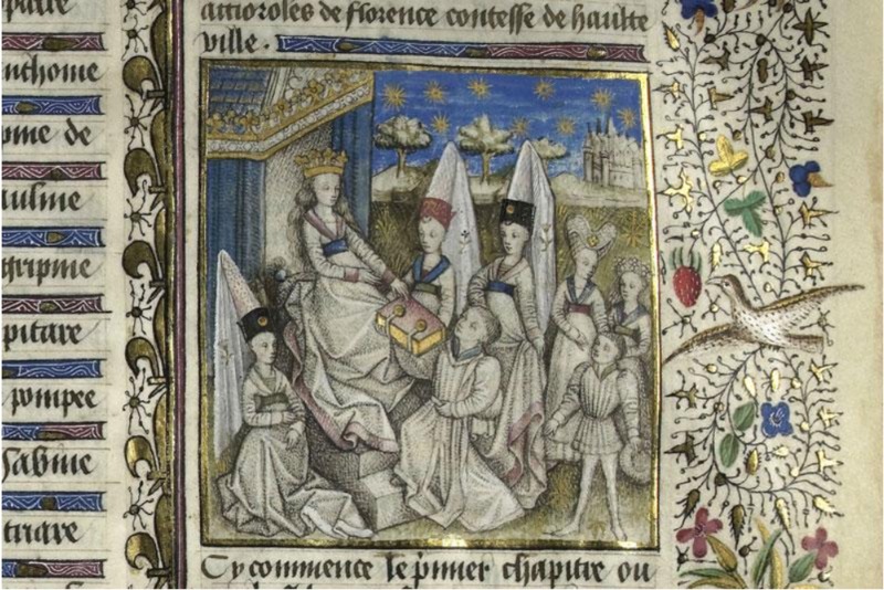 Chantilly, Bibliothèque du Château de Chantilly, 856, f. 32r. L'autore Giovanni Boccaccio offre il libro alla contessa d'Altavilla, circondata dal suo seguito.
