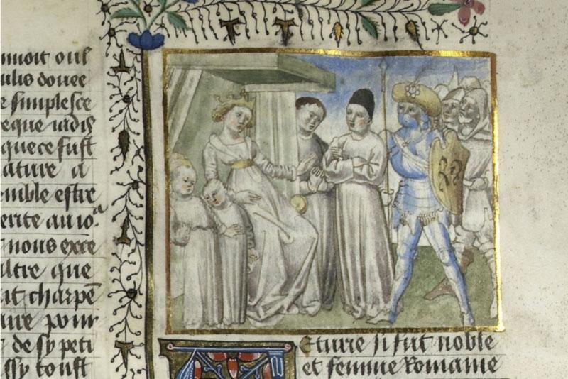 Chantilly, Bibliothèque du Château de Chantilly, 856, f. 82r. Veturia, rappresentata come una regina in trono (il modello è frainteso) accanto ai nipoti, dissuade il figlio Coriola…