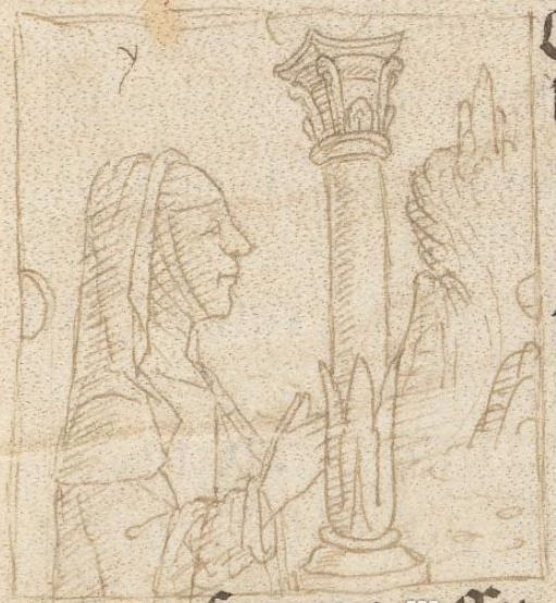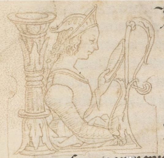 Cambridge (Mass.), Harvard University, Houghton Library, Richardson 41, f. 5r. Una giovane donna con un cappello (Ipermestra?), all'interno dell'iniziale figurata I(permestra).
