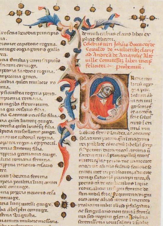 Oxford, Bodleian Library, Canon. misc. 58, f. 1v. Ritratto dell'autore Giovanni Boccaccio con un libro, all'interno dell'iniziale figurata P(ridie).