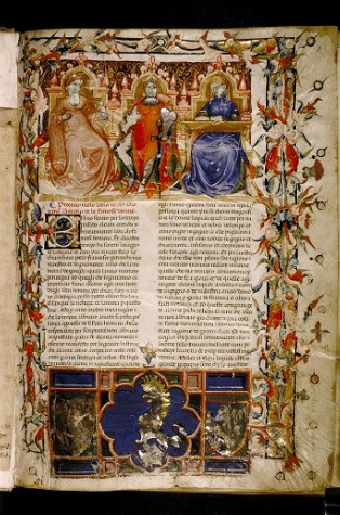 Oxford, Bodleian Library, Canon. Ital. 86, f. 1r. Tre personaggi femminili seduti in trono: a sinistra una donna dalla veste rosa con un cagnolino addomesticato (allegoria della St…