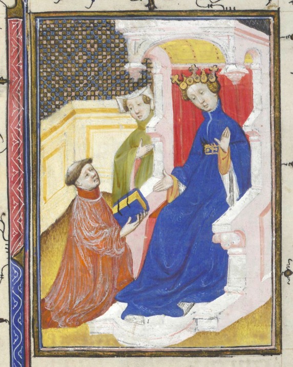 Bruxelles, Koninklijke Bibliotheek van België, 9509, f. 3r. L'autore Giovanni Boccaccio, inginocchiato, offre il libro alla contessa d'Altavilla.