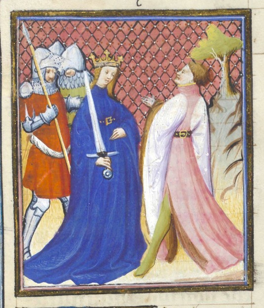Bruxelles, Koninklijke Bibliotheek van België, 9509, f. 9r. Semiramide, regina di Babilonia, incontra suo figlio alla testa di un gruppo di soldati.