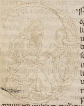 Cambridge (Mass.), Harvard University, Houghton Library, Richardson 41, f. 1r. Un vecchio barbuto siede leggendo un libro retto da un giovane putto, all'interno dell'iniziale istor…