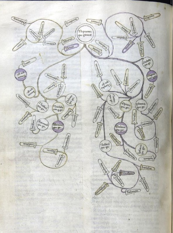 València, Universitat de València. Biblioteca Històrica, BH Ms. 291, f. 40v. Albero genealogico di Celo e Titano.