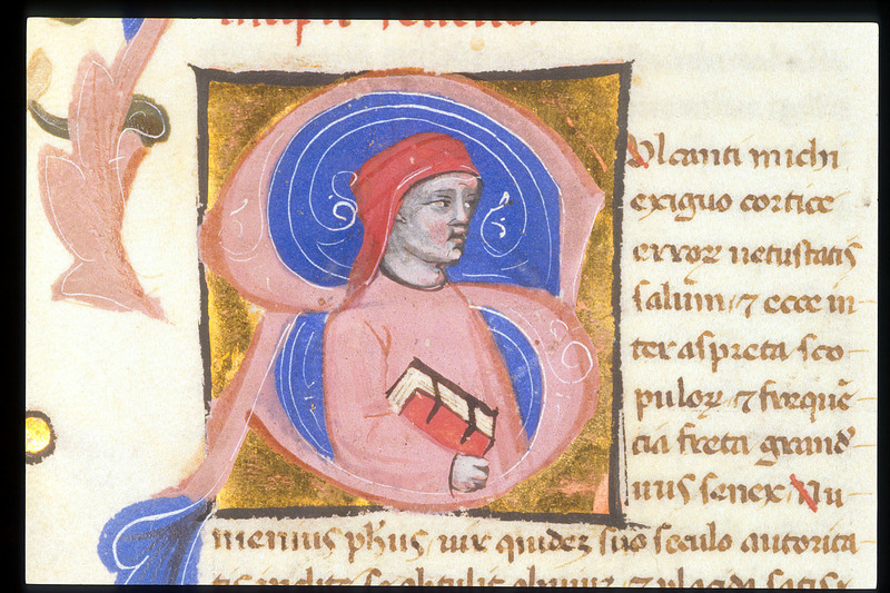 Londra, British Library, Egerton 1865, f. 98v. Il manoscritto è datato 23 giugno 1388. Un uomo a mezzobusto con un libro, all'interno dell'iniziale figurata M(itiori).