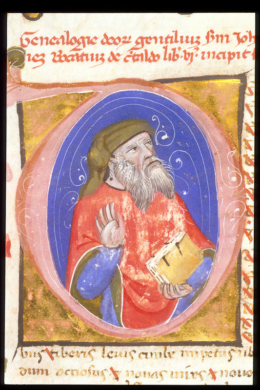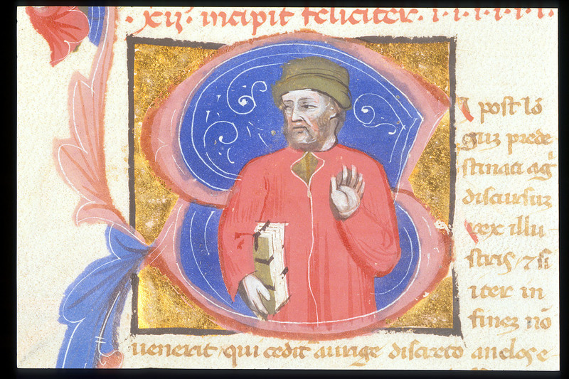 Londra, British Library, Egerton 1865, f. 44r. Il manoscritto è datato 23 giugno 1388. Un uomo con la barba a mezzobusto vestito di rosso con un libro, all'interno dell'iniziale fi…