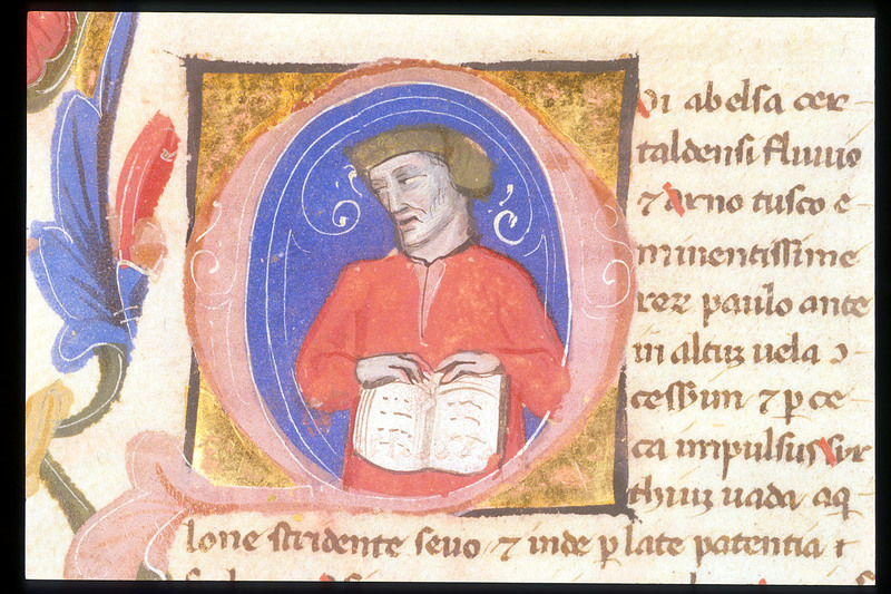 Londra, British Library, Egerton 1865, f. 129v. Il manoscritto è datato 23 giugno 1388. Un uomo a mezzobusto vestito di rosso con un libro sotto braccio, all'interno dell'iniziale …