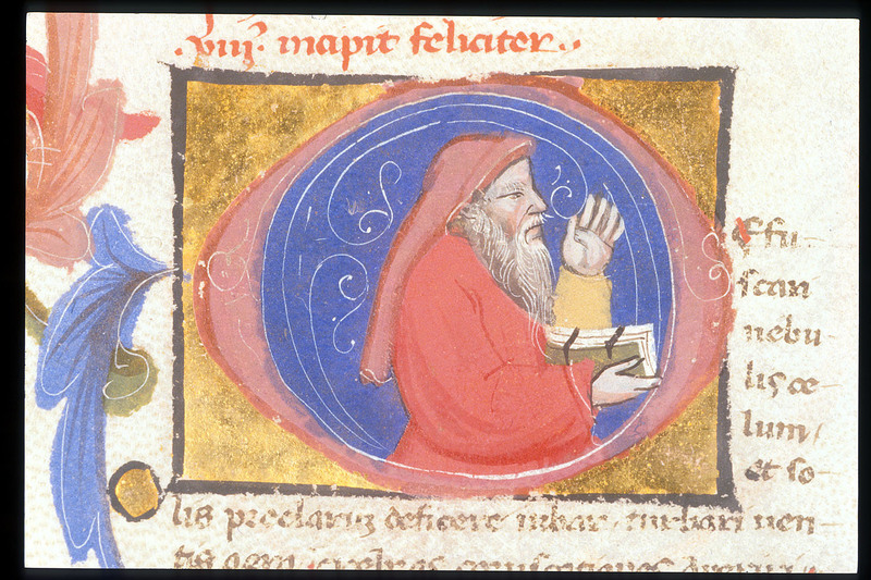 Londra, British Library, Egerton 1865, f. 72v. Il manoscritto è datato 23 giugno 1388. Un uomo con la barba a mezzobusto vestito di rosso con un libro, all'interno dell'iniziale fi…