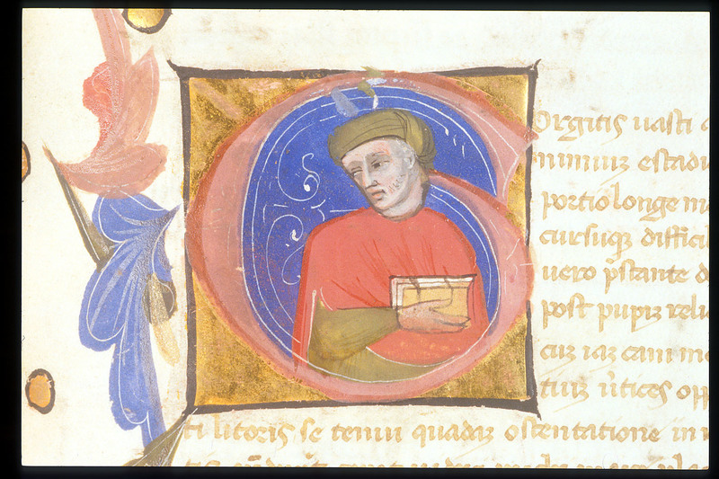Londra, British Library, Egerton 1865, f. 91v. Il manoscritto è datato 23 giugno 1388. Profilo di uomo barbuto con un libro, all'interno dell'iniziale figurata O(ffuscari).