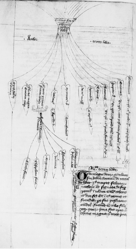Parigi, Bibliothèque Nationale de France, Lat. 14636, f. 201v. Albero genealogico di Celo e Titano.