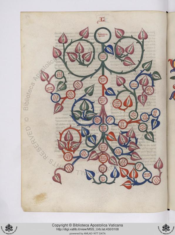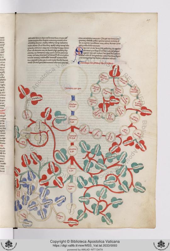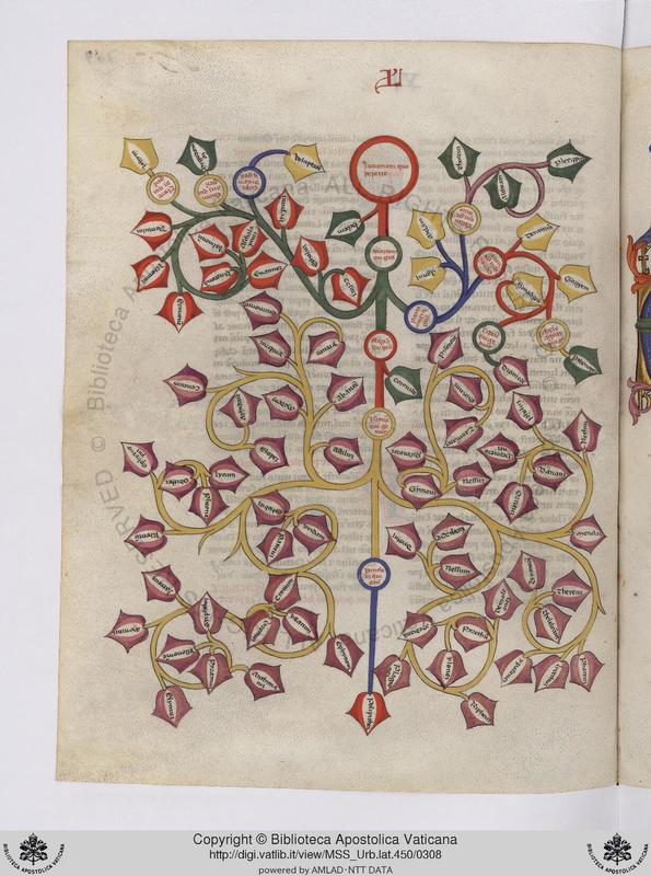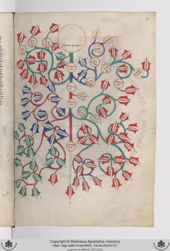 Città del Vaticano, BAV, Vat. lat. 2033, f. 25r. Albero genealogico di Celo e Titano.