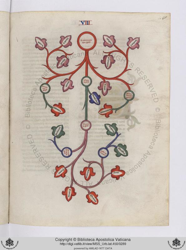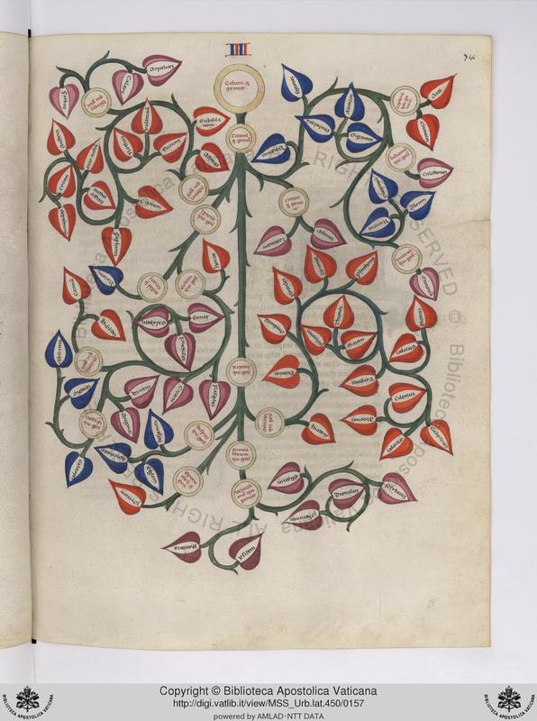 Città del Vaticano, BAV, Urb. lat. 450, f. 74r. Albero genealogico di Celo e Titano.