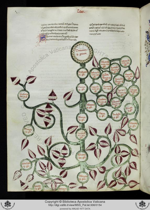 Città del Vaticano, BAV, Pal. lat. 936, f. 74v. Albero genealogico di Dardano.
