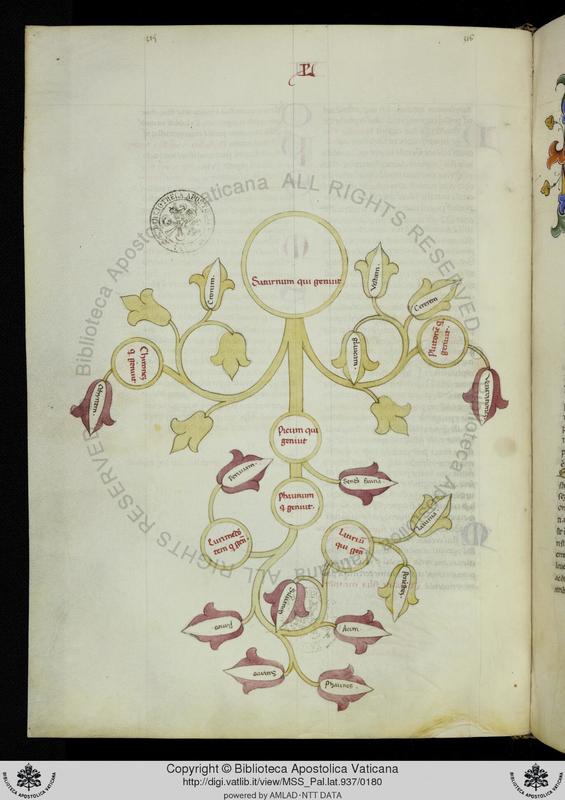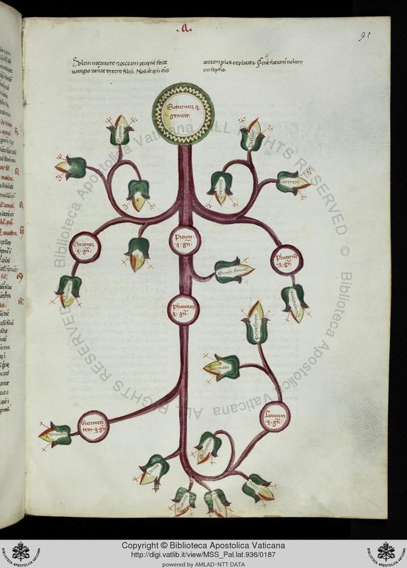 Città del Vaticano, BAV, Pal. lat. 937, f. 43r. Albero genealogico di Celo e Titano.
