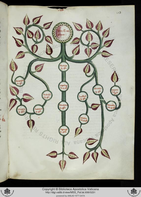 Città del Vaticano, BAV, Pal. lat. 936, f. 48v. Albero genealogico di Celo e Titano.