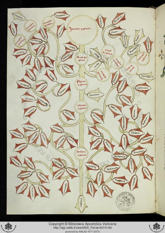 Città del Vaticano, BAV, Pal. lat. 936, f. 96v. Albero genealogico di Giunone.