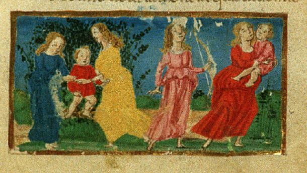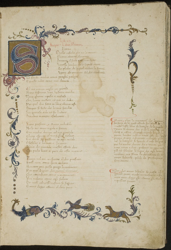 Firenze, Biblioteca Riccardiana, Ricc. 1503, f. 106r. Il copista del manoscritto, datato 1482, è Nicola Mangona. Le ninfe scoprono Pruneo nascosto tra i cespugli e decidono di port…