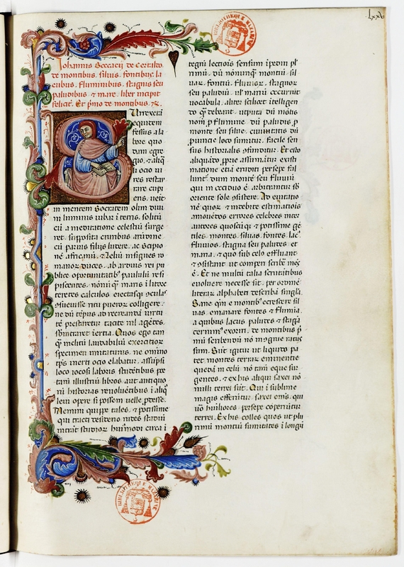 Città del Vaticano, Biblioteca Apostolica Vaticana, Reg. lat. 1477, f. 1r. L'autore Giovanni Boccaccio legge un libro assiso in cattedra, immerso in un paesaggio rappresentato con …