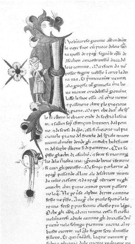 Milano, Biblioteca Ambrosiana, C 199 inf., f. 150v. Il manoscritto è datato 8 ottobre 1462. Florio dinanzi a una città turrita (Roma?), all'interno dell'iniziale istoriata A(spro).