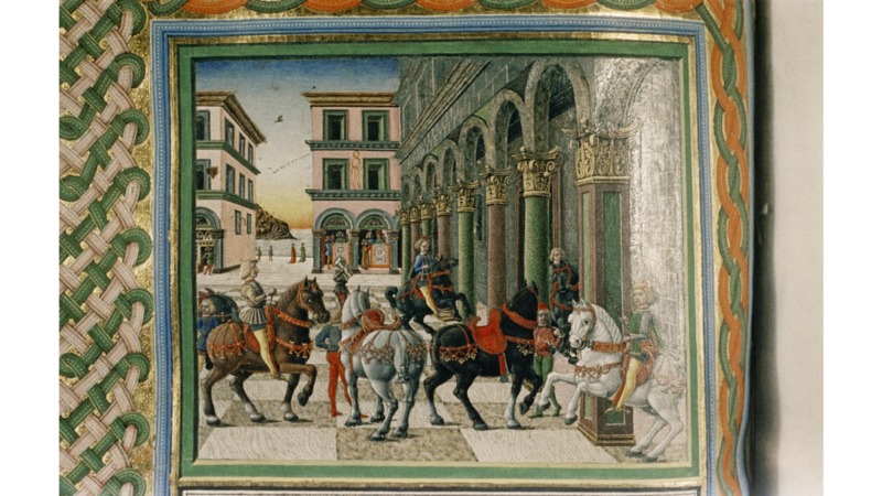 Oxford, Bodleian Library, Canon. Ital. 85, f. 114v. Il copista del manoscritto è Andrea de Laude (Andrea da Lodi). Florio e i suoi compagni sono a cavallo in una piazza.