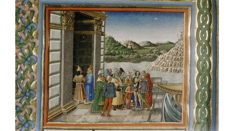 Milano, Biblioteca Ambrosiana, C 199 inf., f. 54r. Il manoscritto è datato 8 ottobre 1462. Il re Felice a colloquio con i mercanti orientali (?), all'interno dell'iniziale istoriat…