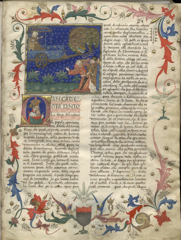 Oxford, Bodleian Library, Canon. Ital. 85, f. 1r. Il copista del manoscritto è Andrea de Laude (Andrea da Lodi). All'interno di un cortile due giovani uomini, insieme ad un papa e …