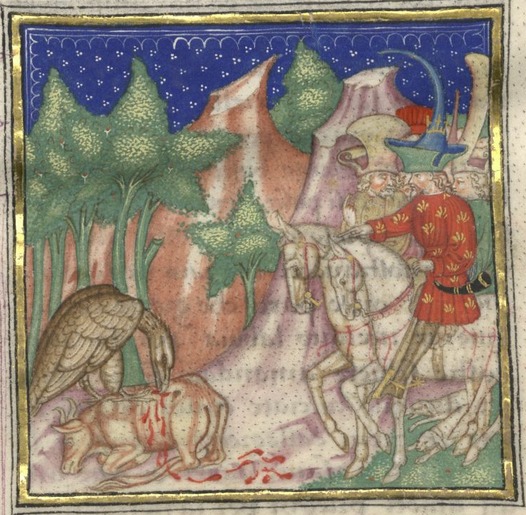 Kassel, Universitätsbibliothek Kassel, Landesbibliothek und Murhardsche Bibliothek der Stadt Kassel, 2° poet. et roman. 3, f. 7ar. Il re Felice indica ai suoi uomini l'aquila che s…