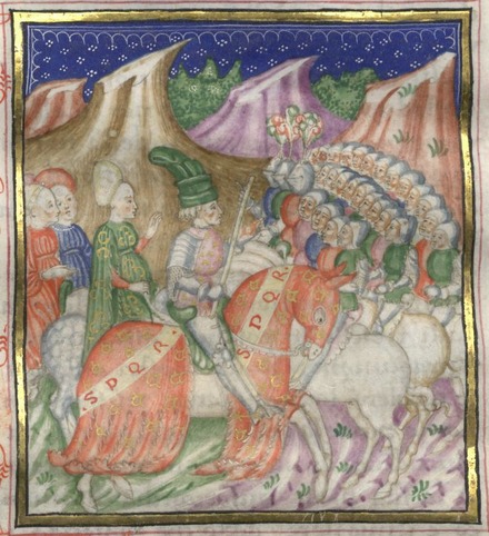Miniatore lombardo (1450 c.), Lelio si rivolge ai suoi uomini divisi in tre schiere