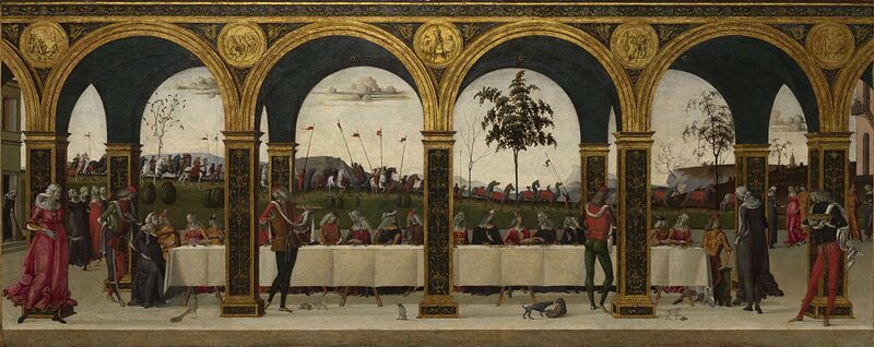 Alessandro Filipepi (Sandro Botticelli) e Bartolomeo di Giovanni (1483), Nastagio degli Onesti mostra ai convitati la visione della caccia infernale