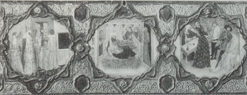 Giovanni di Francesco Toscani (1420-1425), Bernabò accetta la scommessa di Ambrogiuolo; Ambrogiuolo corrompe la domestica per introdursi in casa di madonna Ginevra nascosto in una cassa; Ambrogiuolo osserva Ginevra dormire, quindi ruba una borsa ed una sopravveste