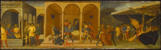 Apollonio di Giovanni (1460-65), Alatiel si imbarca per il suo viaggio; naufragio della nave di Alatiel; Pericone da Visalgo salva le donne e le conduce al suo castello