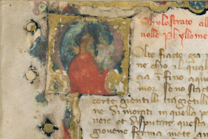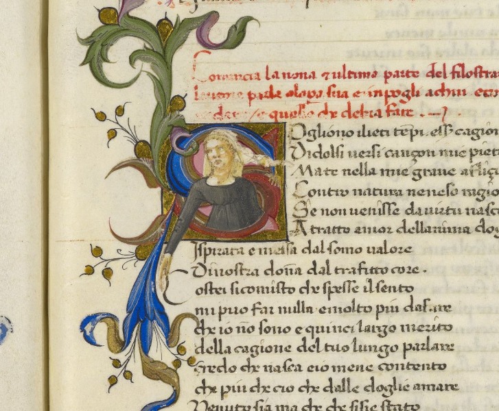 Firenze, Biblioteca Medicea Laurenziana, Plut. 41.28, f. 1r. Busto dell'autore Giovanni Boccaccio, all'interno dell'iniziale figurata M(olte).