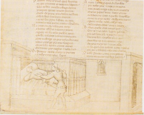 Firenze, Biblioteca Nazionale Centrale, II.II.90, f. 70v. Pandaro tenta di consolare l'amico Troiolo, preda delle sofferenze d'amore.