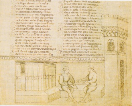 Firenze, Biblioteca Nazionale Centrale, II.II.90, f. 74v. Troiolo e Pandaro si recano da Criseide, la quale li osserva dalla finestra.