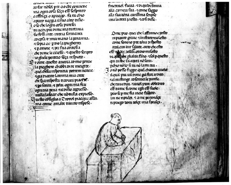 Firenze, Biblioteca Nazionale Centrale, II.II.90, f. 75r. Troiolo scrive una lettera d'amore a Criseide.